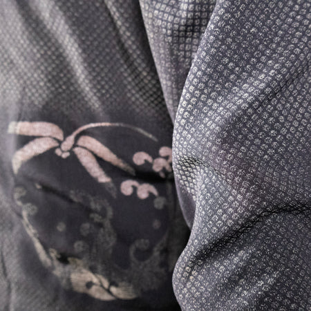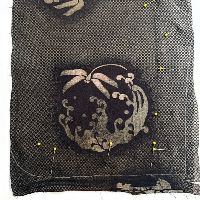 I repurposed fabric from a rare tomesode kimono featuring vignettes from The Tale of Genji, Japan's most famous book, which is often considered one of the world's first novels. The author Lady Murasaki is depicted ensconced in voluminous, layered robes worn in the style of a Heian-era noblewoman. Caligraphy script stencilled with dye (not written with ink) quote some of the book's famous passages. These pictoral motifs originally skirted the bottom hem of the kimono, leaving the upper half completely solid – but in dark green, not the customary black. I consider this kimono a masterpiece of Japanese textile art, and I have preserved the artist's signature on an interior pocket.