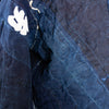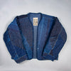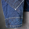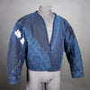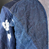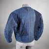 This is the third piece in a new series of quilted jackets. I made the pattern from a vintage bomber jacket, and the sleeve panels are engineered for reaching forward. The fabrics are from a vintage Japanese happi coat that I deconstructed. Darker areas were concealed in hems, and lighter areas were exposed to wear. The kanji characters were stenciled on the collar piece before dyeing. The fabrics are all cotton and dyed with plant indigo.