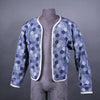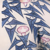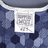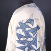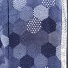 Also stenciled onto silk crepe, the lining features a small scale komon pattern. The intricate blue and white patchwork of hexagons contains a glossary of traditional Japanese komon motifs. Though in a completely different vein than the outer fabric, the lining also showcases the stencil-cutter's art with its intricacy and precision.