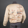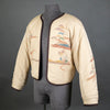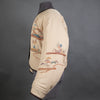 I made the lining from another vintage kimono that I deconstructed. It's a heavyweight silk crepe stenciled with a variety of children's playthings. The back measures 22" from neckline to bottom hem and 26" armpit to armpit. The arm measure 30" from neckline to hem.