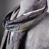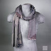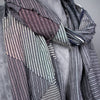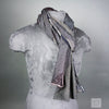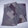 This extra long oblong scarf is comprised of 41 pieces of vintage kimono fabrics. All the pieces are cut on the bias, and the perimeter edges are all original fabric selvedge. The fabrics are cotton as well as cotton and silk blends. Loose threads remain in some places from the original hand-sewn seams of the vintage kimonos. An original, hand-sewn, mended patch remains on the wide end of the scarf.