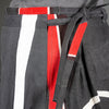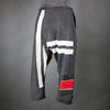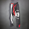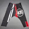 I made these Japanese style worker pants from two vintage happi coats. They display the graphic stripes and circles typical of festival wear. The irregular bottom edges are mostly fabric selvedges. The left leg has no side seam (but a wrapped panel instead, so I had to improvise when inserting the slash pocket.