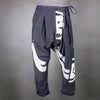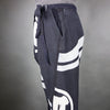 The adjustable ties accommodate waistlines in the 31-35" range. The irregular, unhemmed bottoms of the pant legs can be rolled and worn at a cropped length.