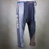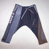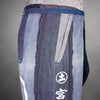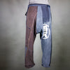 The repurposed textile panels are arranged in three sections: going from a vertical orientation on the right leg to slanted seams on the left leg. Two large, vintage, hand-sewn patches appear on the left leg, and half of a large mon crest falls on the backside.