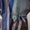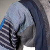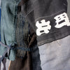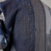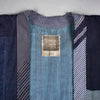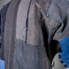 I made this piecework jacket using fabrics from 17 different vintage kimono and happi, including lining materials, patches, and reinforcements. The collar reprises fabrics from eleven of these same garments. Large sections of hand-stitched boro repair work appear on the back left shoulder and the right front shoulder. There are also many plant indigo-dyed fabric pieces as well as woven stripes, stenciled stripes, and stenciled kanji.